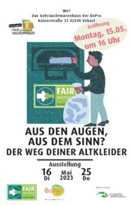 Antworten auf diese Fragen und mehr zeigt Euch die Ausstellung des Dachverbandes FairWertung e.V., dem bundesweiten verband gemeinnütziger Alttextilsammler. Ihr bekommt wichtige Tipps für nachhaltigen Textilkonsum und könnt Euch sogar selbst als Sortierer*in beim Alttextiliensortieren ausprobieren. Hier könnt ihr den Weg Eures T-Shirts von der Abgabe bis ans Ende der Kette nachverfolgen.